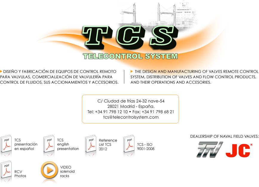 TCS - presentación en español TCS - english presentation Reference List TCS 2008 Certificado ISO 9001 - español Certificate ISO 9001 - english VIDEO - Solenoid Racks